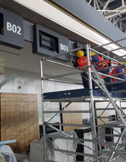Construction of Aircraft Apron pavement (50,000m2): Grade, level and compact the sub-grade. Bury all existing communication and power lines including conduits required. Construct the concrete pavement by; Install polyethylene sheet layer, formworks & dowels. Pour concrete in the panel – alternate sequence, curing. Construct expansion joints. Lay asphalt on the apron driveway. Provide pavement marking.